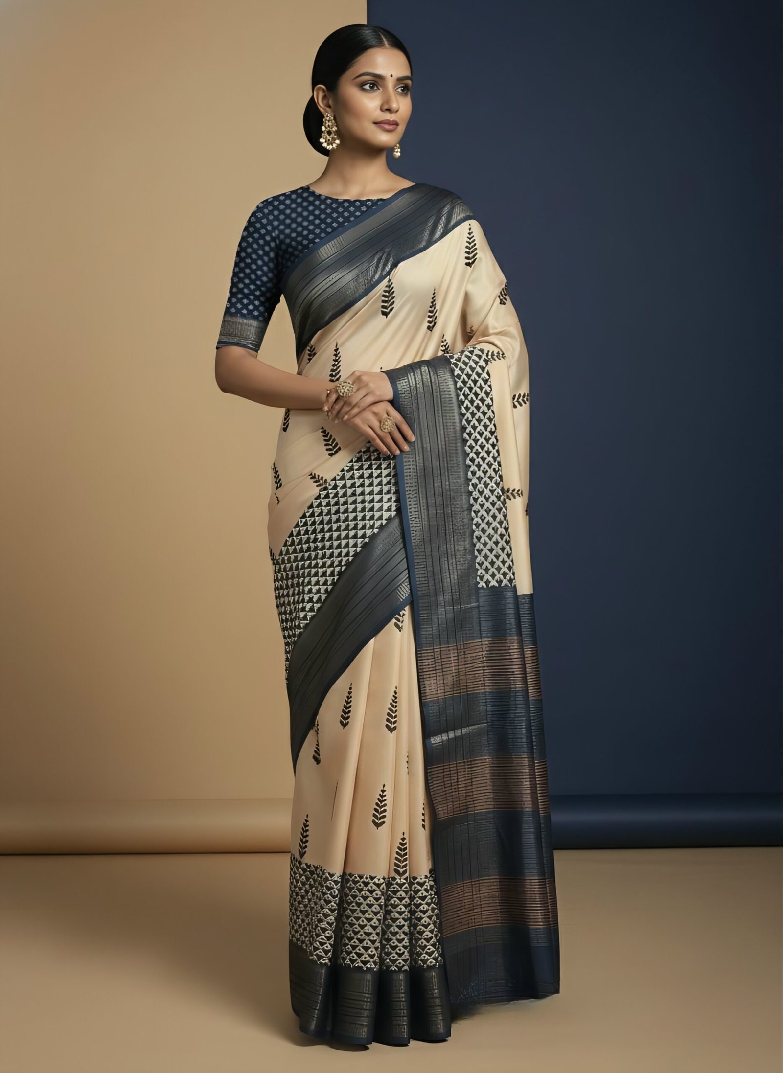 • Classic beige & navy with leaf motifs & woven border
