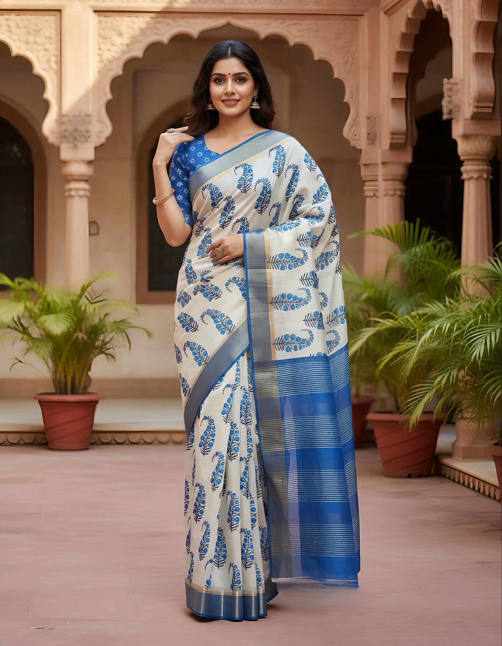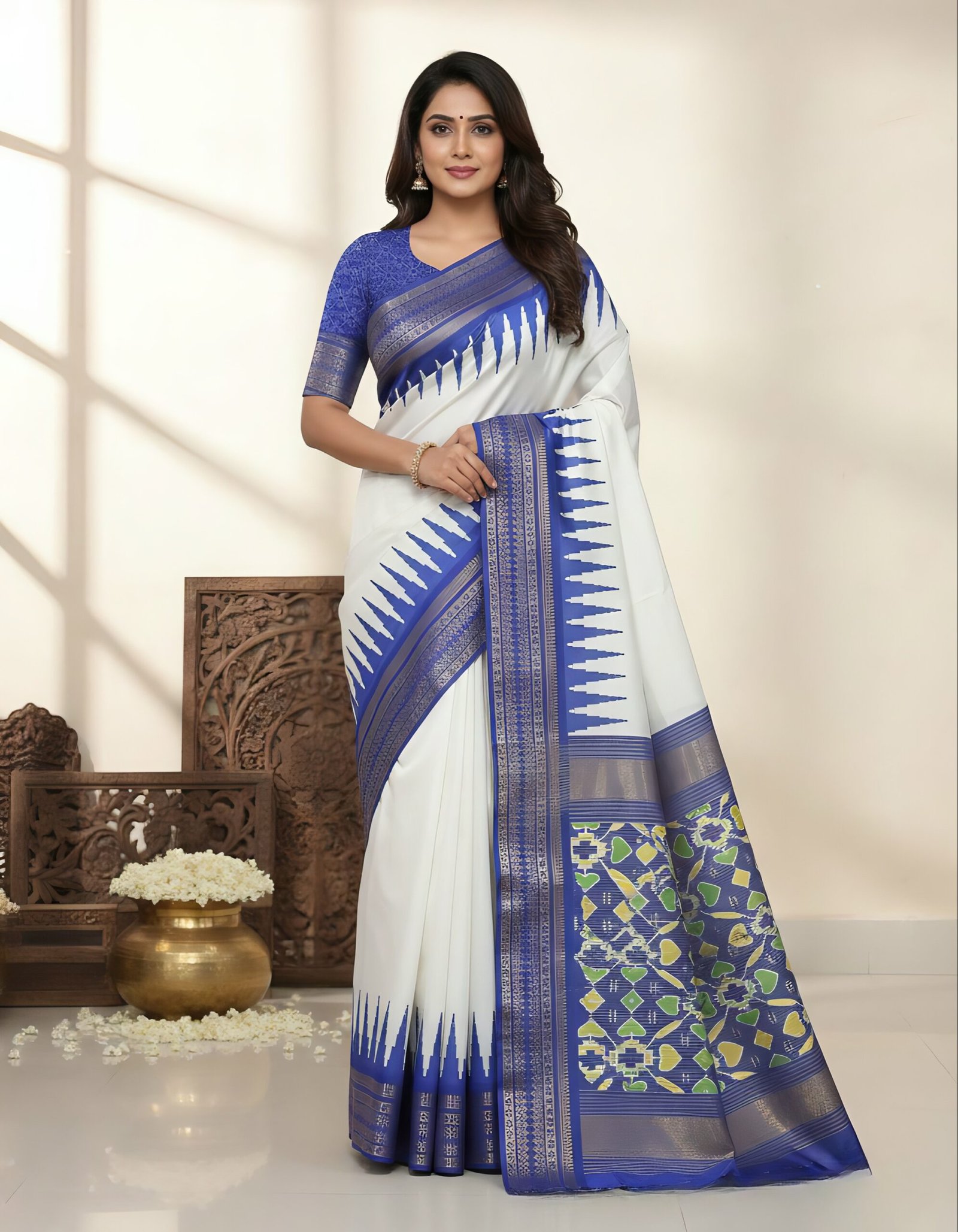 • White saree with striking blue temple border