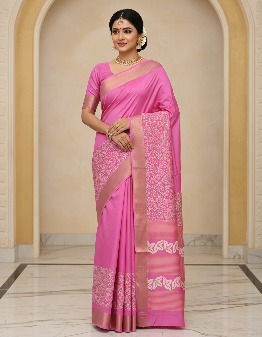 Designed with soft, lightweight silk-blend fabric, these sarees offer a smooth drape, rich finish, and effortless comfort. The detailed motifs, geometric patterns, leafy designs, and contemporary pallu styles add a premium touch to your wardrobe.