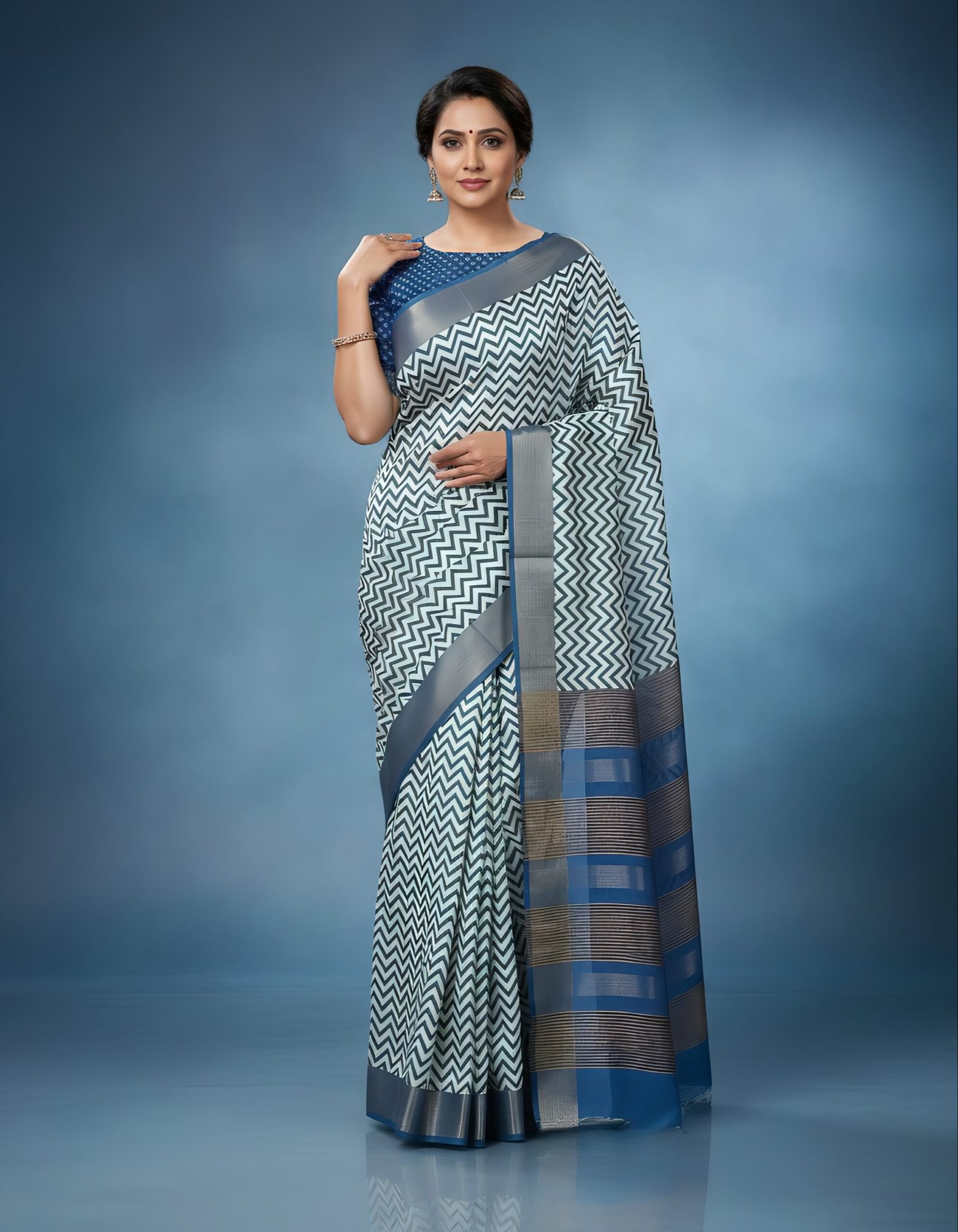 • Blue-white zig-zag patterned saree with designer pallu