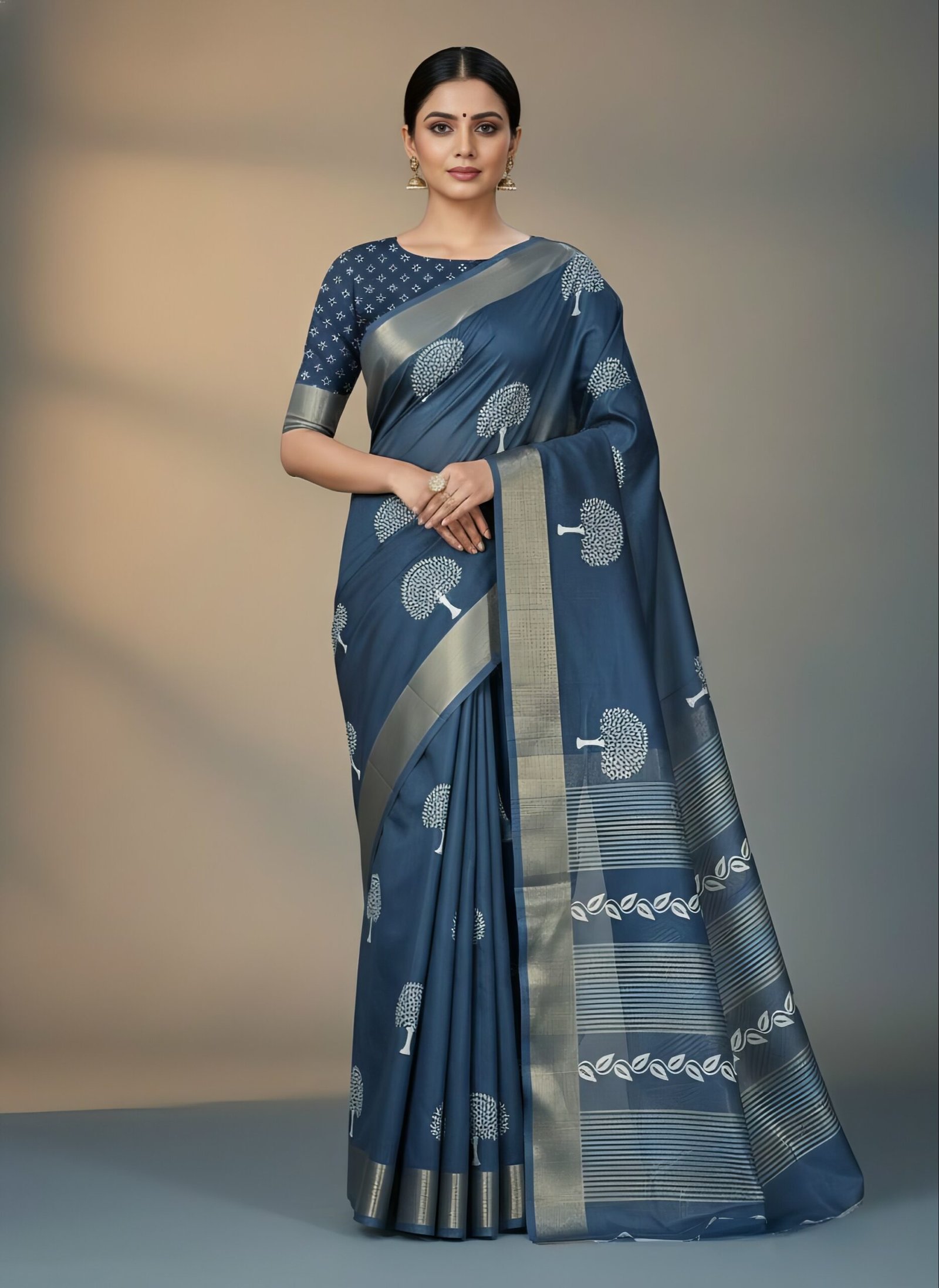 • Royal blue saree with tree motifs and silver zari border